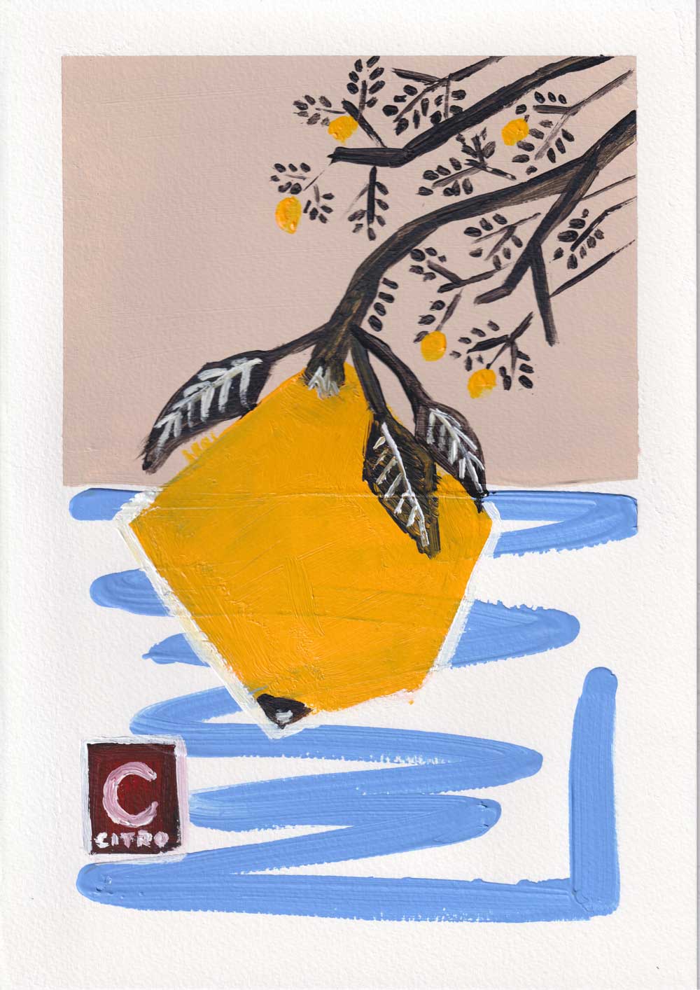 A lemon hanging on a tree, this graphic style piece is for those that love advert style art, painted by hand with acrylic on A4 350gsm card.
