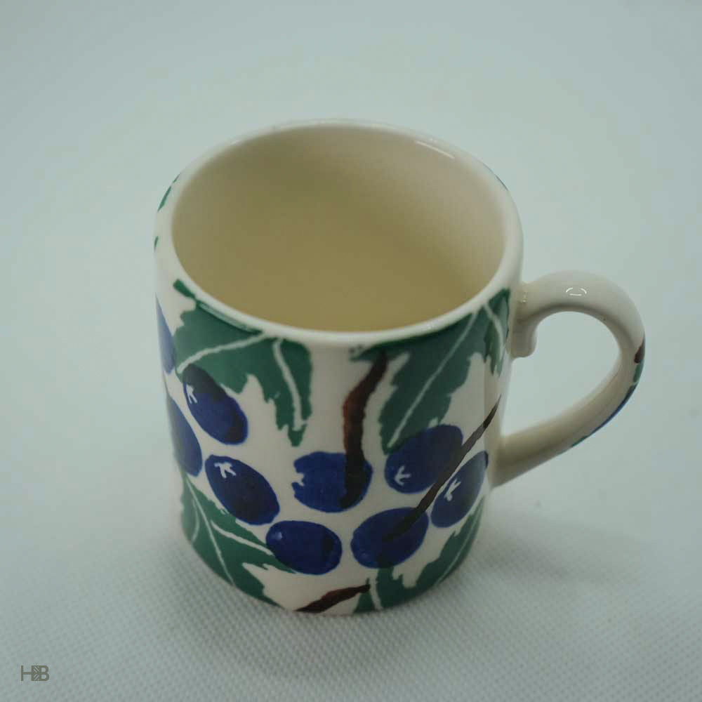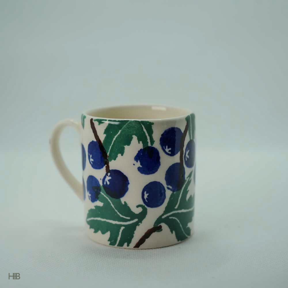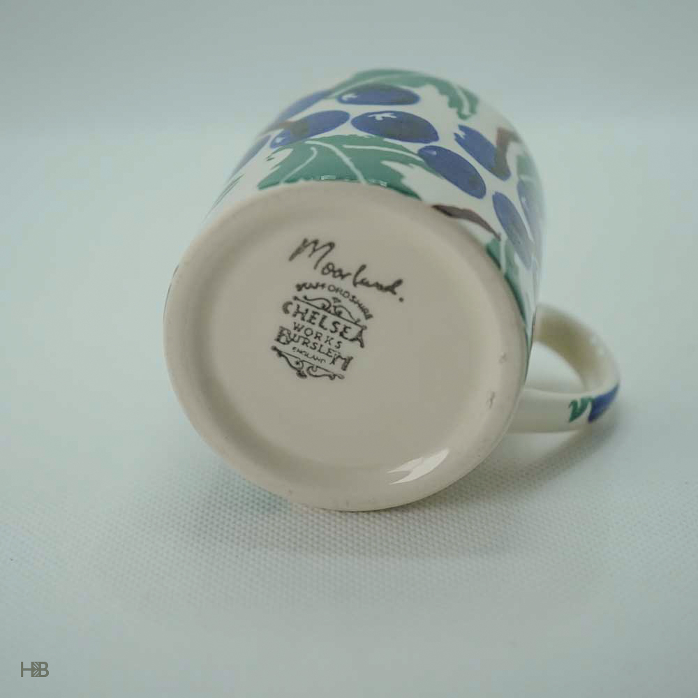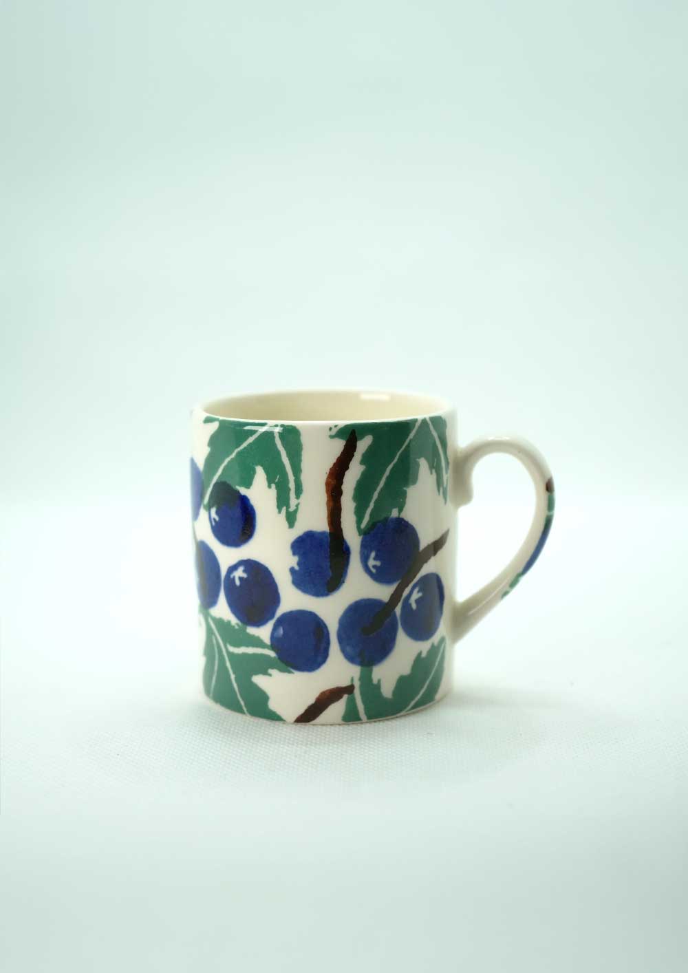 A delicately beautiful Moorland Chelsea Burslem Stoke on Trent ceramic cup adorned with Blueberries, a fun and yet classic design.