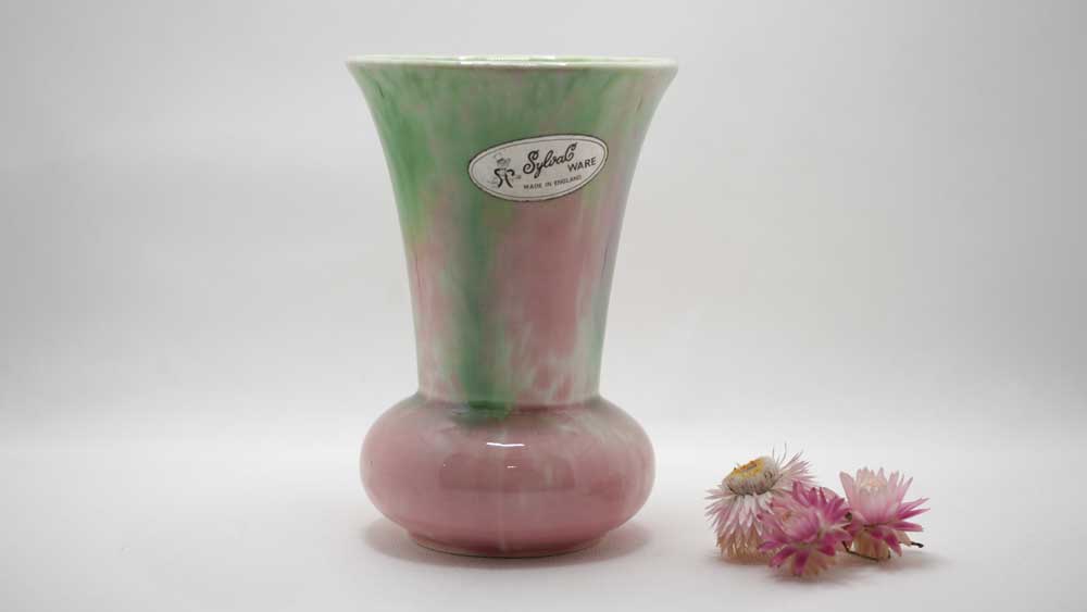 This Sylvac Art Deco vase is a striking example of the elegance and bold aesthetic that defined the Art Deco period. The soft and inviting pink hue of this little vase serves as the perfect backdrop for the vase’s most distinctive feature: a cascading green rim that elegantly flows over the pink, reminiscent of lush greenery draping over a blush-colored landscape.