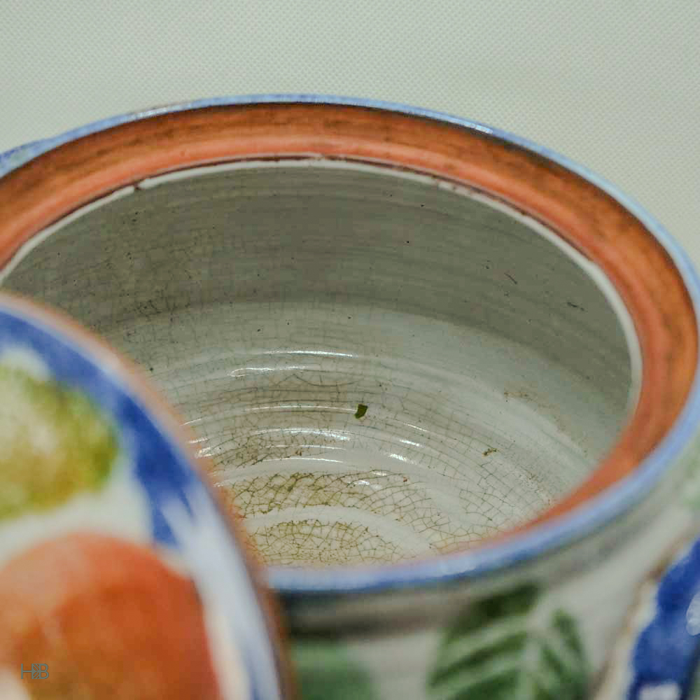 A beautifully presented casserole dish with hand painted fruits, made in the USA and marked at the base with Rob Bibb stamp, only one in stock.