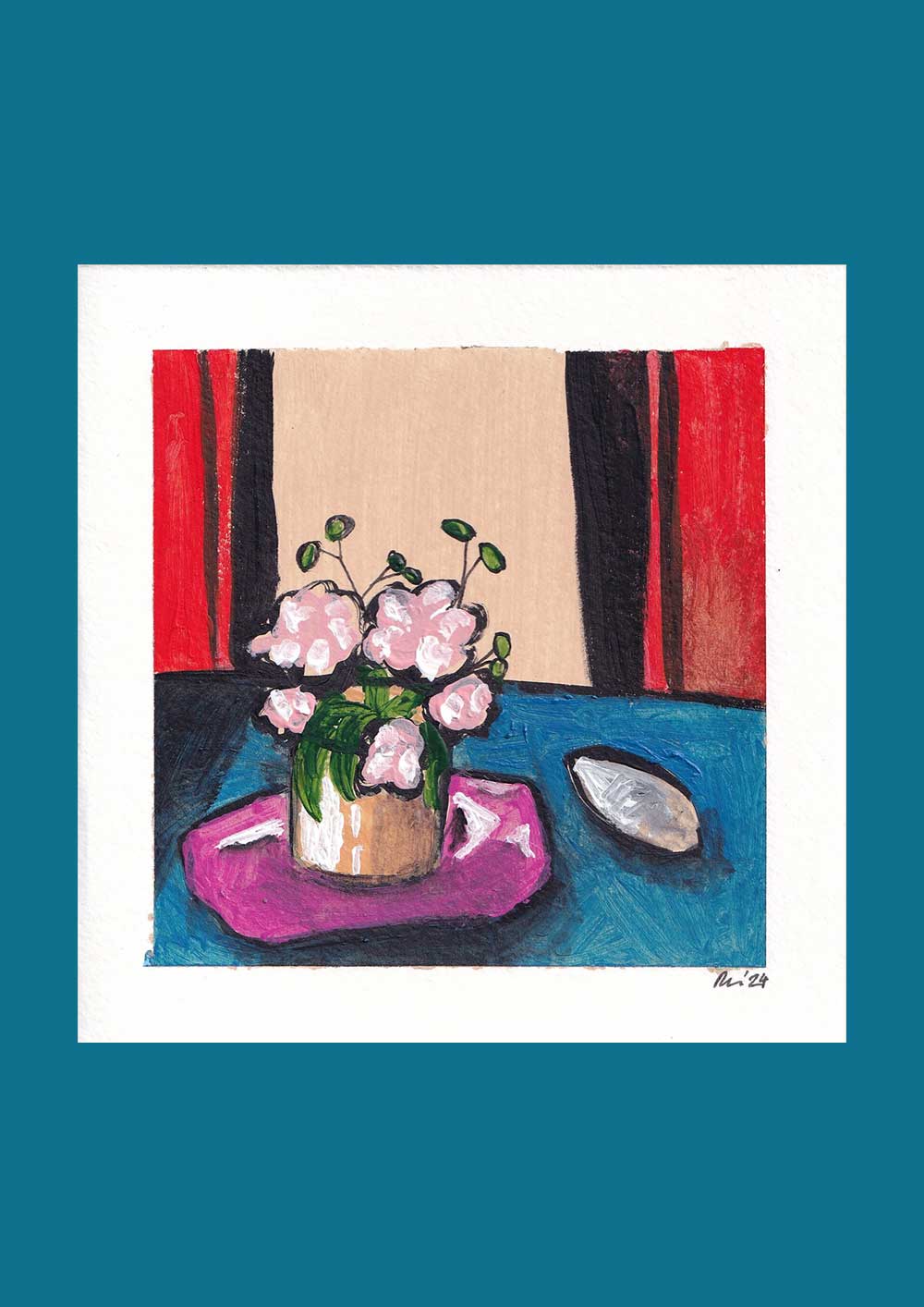 Vases & Flowers 1 – 14x14cm acrylic, One of a series of individual hand painted art greetings cards, a perfect card as a gift alongside one of our ceramic pieces.